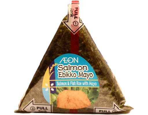 A delicious rice ball filled with salmon, ebikko, and creamy mayo.